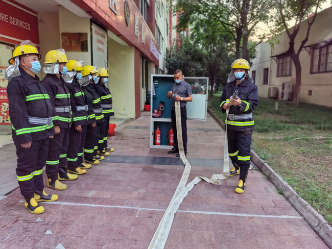 “立正,向右看齊,向前看 ?!?9月1日,園區(qū)公舍微型消防站,建發(fā)公司正在開展應(yīng)急救援集訓(xùn),訓(xùn)練場上身穿著消防服的“消防員們”個(gè)個(gè)精神飽滿、斗志昂揚(yáng)。