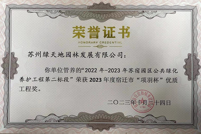 近日,由宿遷市蘇宿園區(qū)建設(shè)發(fā)展有限公司負責(zé)管理的蘇宿工業(yè)園區(qū)2022-2023年公共綠化養(yǎng)護工程第一、二標段,同時榮獲2023年度宿遷市“項羽杯”優(yōu)質(zhì)工程獎。