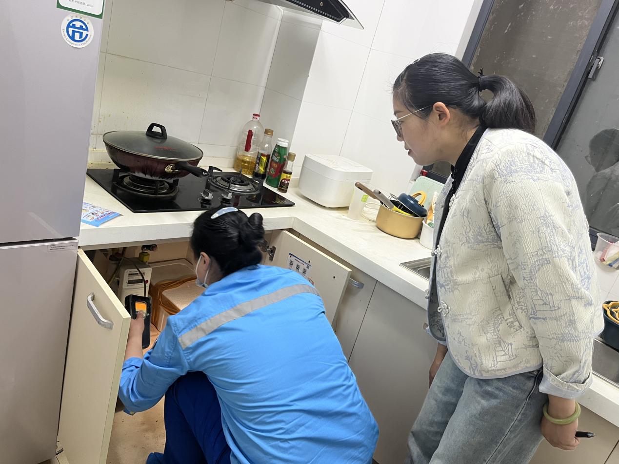 工作人員對(duì)燃?xì)庥脩糸_展逐戶檢查,重點(diǎn)對(duì)天然氣接口軟管是否老化、燃?xì)馄骶呤欠癯谑褂谩⑹欠裼邢ɑ鸨Wo(hù)措施,燃?xì)忾y門是否正常使用等問題進(jìn)行全面檢查。在檢查過(guò)程中,發(fā)現(xiàn)廚房操作間積堆物品、線路交叉重疊等現(xiàn)象,要求客戶立即整改。