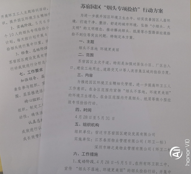 為了確保“煙頭專項撿拾”行動順利開展,公司結合園區(qū)實際,精心籌劃,制定了《蘇宿園區(qū)“煙頭專項撿拾”行動方案》。