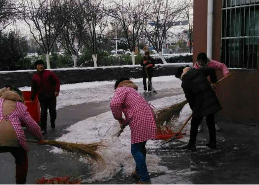 次日氣溫驟降,零下4度,多數(shù)路面存在結(jié)冰現(xiàn)象,加上路面落葉較多。天未亮,保潔、安保人員就到達(dá)園區(qū)公舍主干道、單元門、地庫出入口等指定區(qū)域,伴隨著凜冽的寒風(fēng),開始除雪化冰。對(duì)于他們來講,這注定又是忙碌的一天,經(jīng)過2個(gè)小時(shí)緊張而有序的忙碌,基本完成了各個(gè)園區(qū)公舍各個(gè)路面、單元門、非機(jī)動(dòng)車道、地庫出入口積雪的清掃工作。