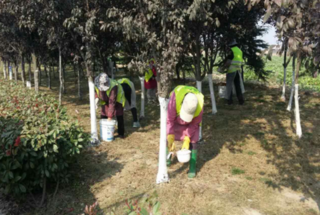 樹干涂白,目的是防治病蟲害和延遲樹木萌芽,還可以提高苗木抗寒、抗病蟲害能力,保樹木安全過冬,為明年樹木良好生長打下基礎(chǔ)。
